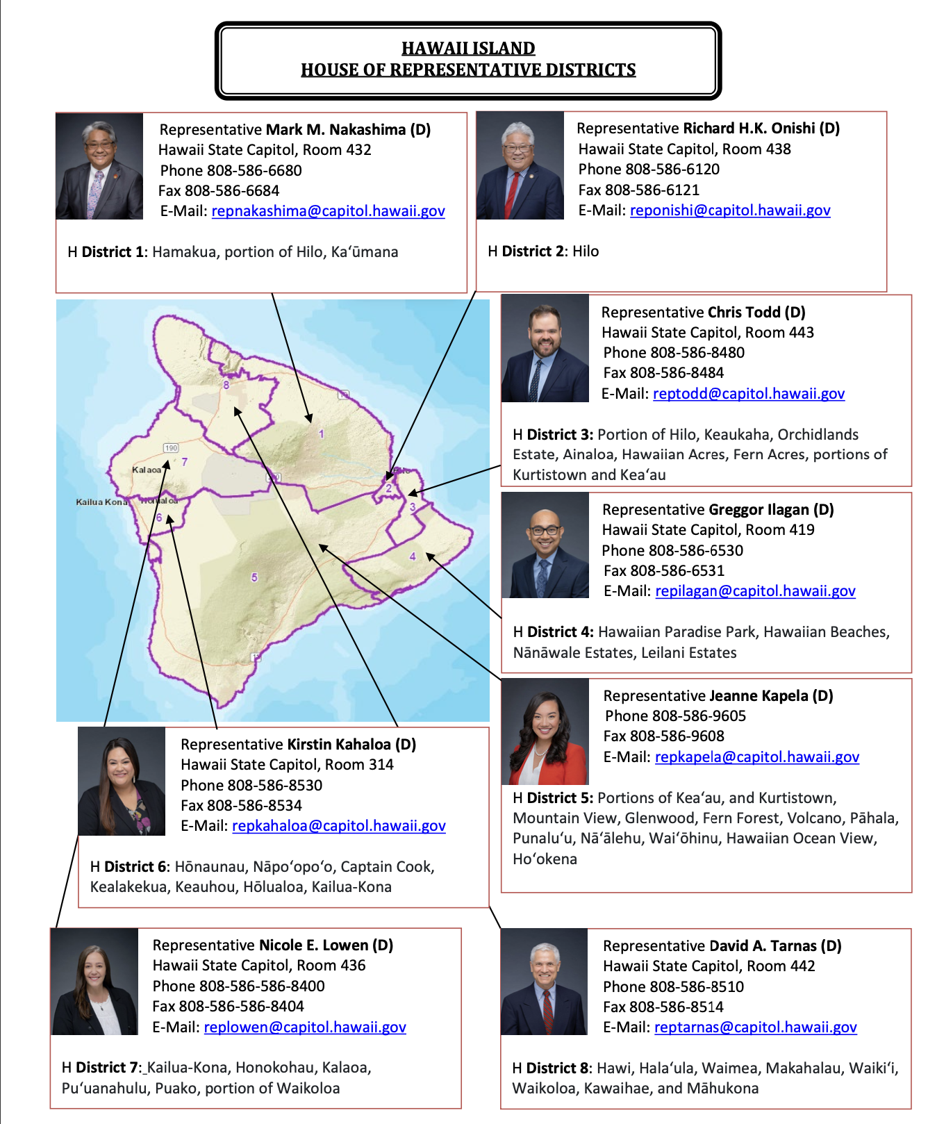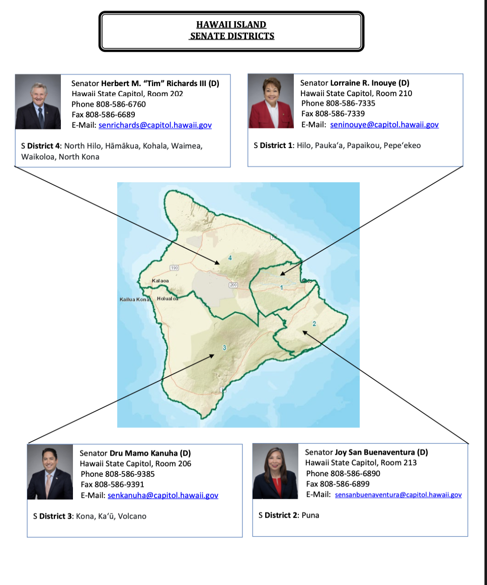 Quickly locate your state house representative and senator on the Hawaii State Legislature website: capitol.hawaii.gov